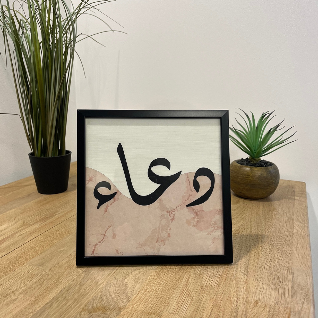 Sublimez votre intérieur avec ce cadre raffiné au fond blanc marbré, symbole d'élégance et de modernité. Orné d'une calligraphie arabe délicate portant le mot "Dou’a" (la prière), ce cadre véhicule un message spirituel profond, idéal pour créer une ambiance paisible et harmonieuse.